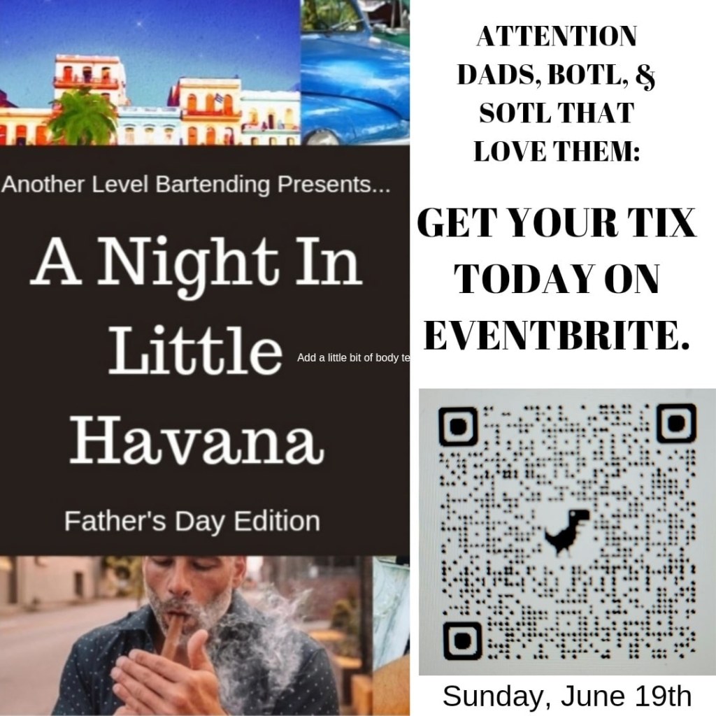 Join us Sunday, June 19th as Another Level Bartending Service takes dad on a little trip to our favorite place…Little Havana. We will recreate the sights, the sounds, a bit of the flavor, the signature cocktails, and of course the SMOKE that are all representative of Little Havana, Miami.